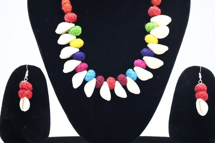 Capture the essence of coastal beauty with this handcrafted sea shell necklace, featuring natural shell elements strung on a vibrant red cotton dori. Designed for both comfort and style, this lightweight piece is perfect for adding a boho or earthy touch to your outfit. Whether worn casually or on festive occasions, it stands out as a statement accessory. Made by skilled SHG artisans, this necklace not only enhances your look but also supports traditional craftsmanship and sustainable livelihoods.