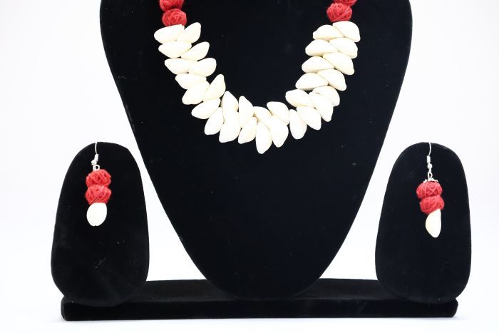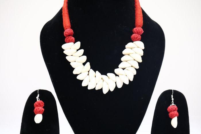 Embrace handcrafted beauty with this elegant necklace and earring set, featuring circular sea shells strung on a striking red dori. The natural texture of the shells combined with the bold color makes it a perfect accessory for ethnic outfits, festive occasions, or beach-inspired looks. The lightweight design ensures all-day comfort, while the adjustable tie-up provides flexibility in styling. Crafted with care by SHG artisans, this set reflects authentic handmade artistry and supports rural women’s empowerment through sustainable fashion.
