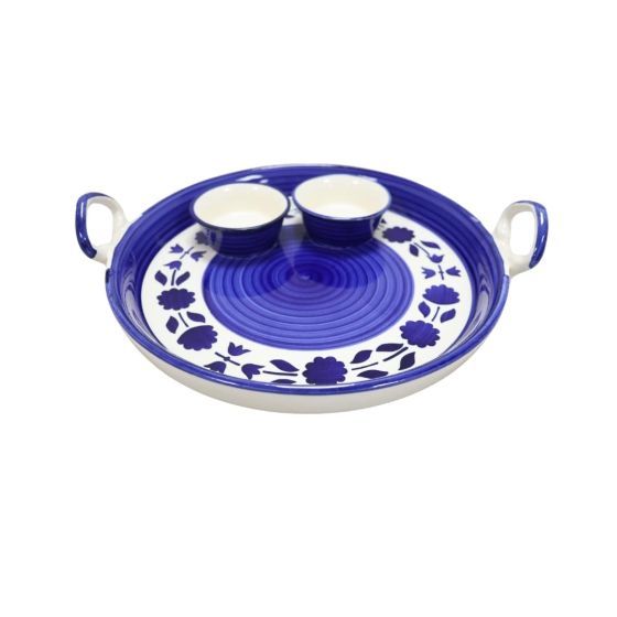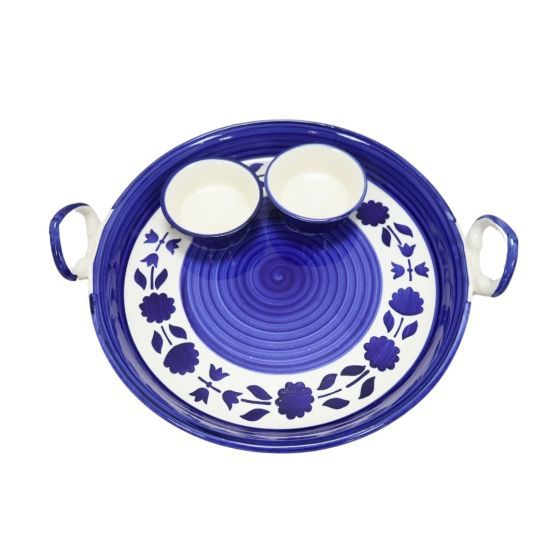 Introducing Saras Aajeevika's Khurja Pottery Pizza Platter White and Blue Leaf Big