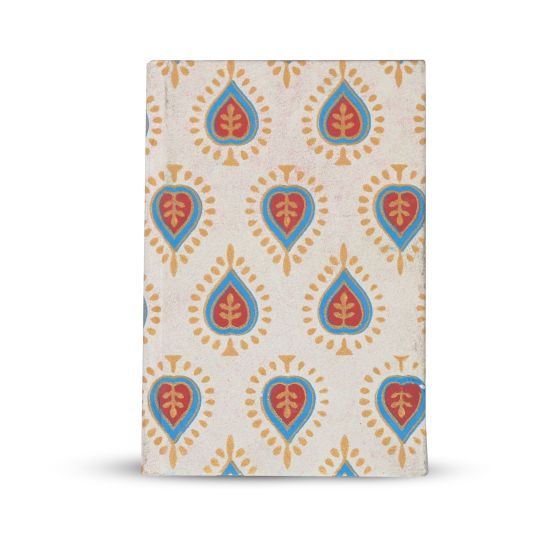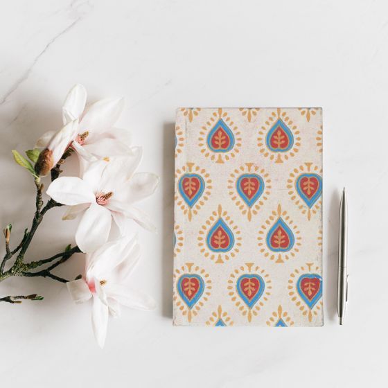 - Cover Design: Attractive white base with hand-printed blue and red heart-flower pattern