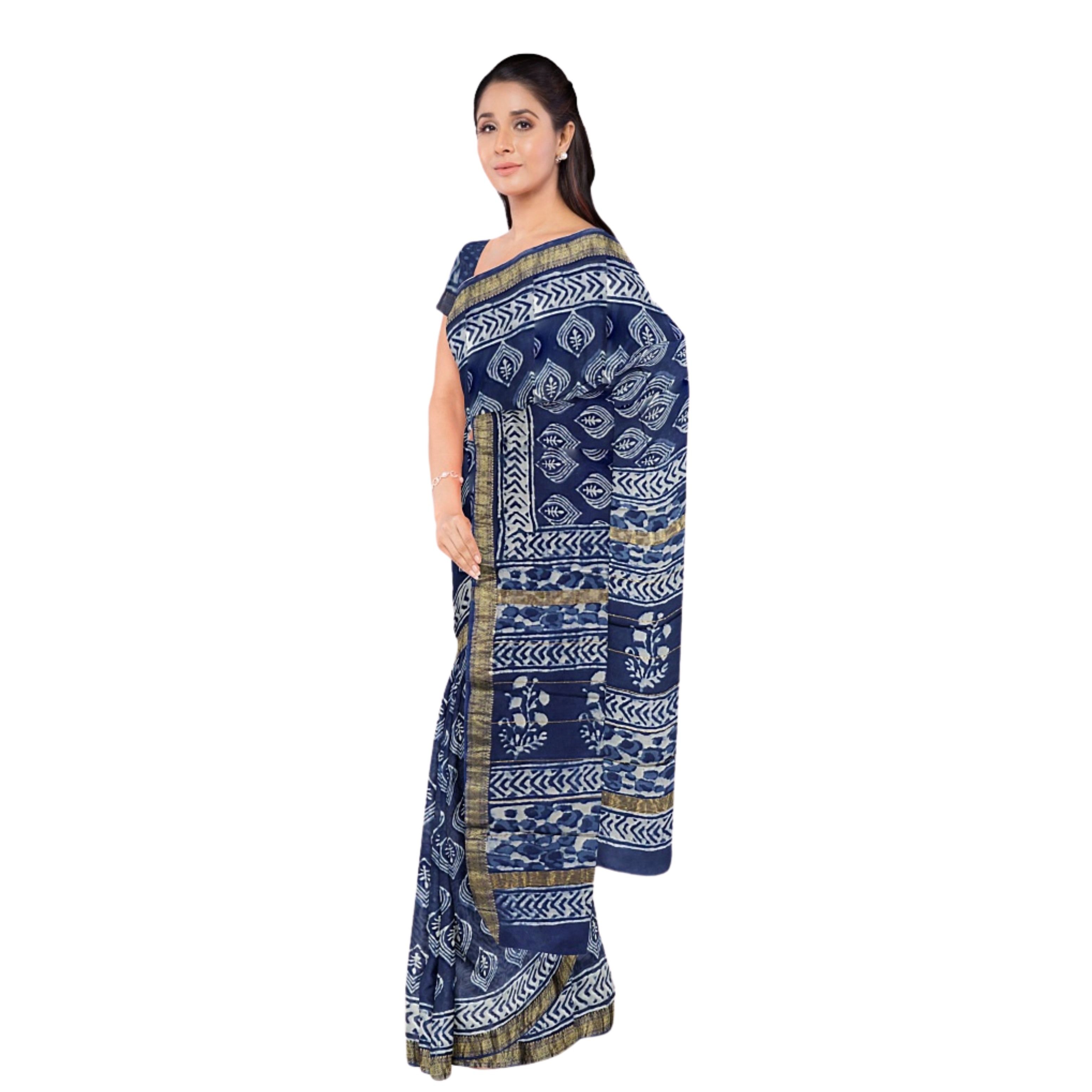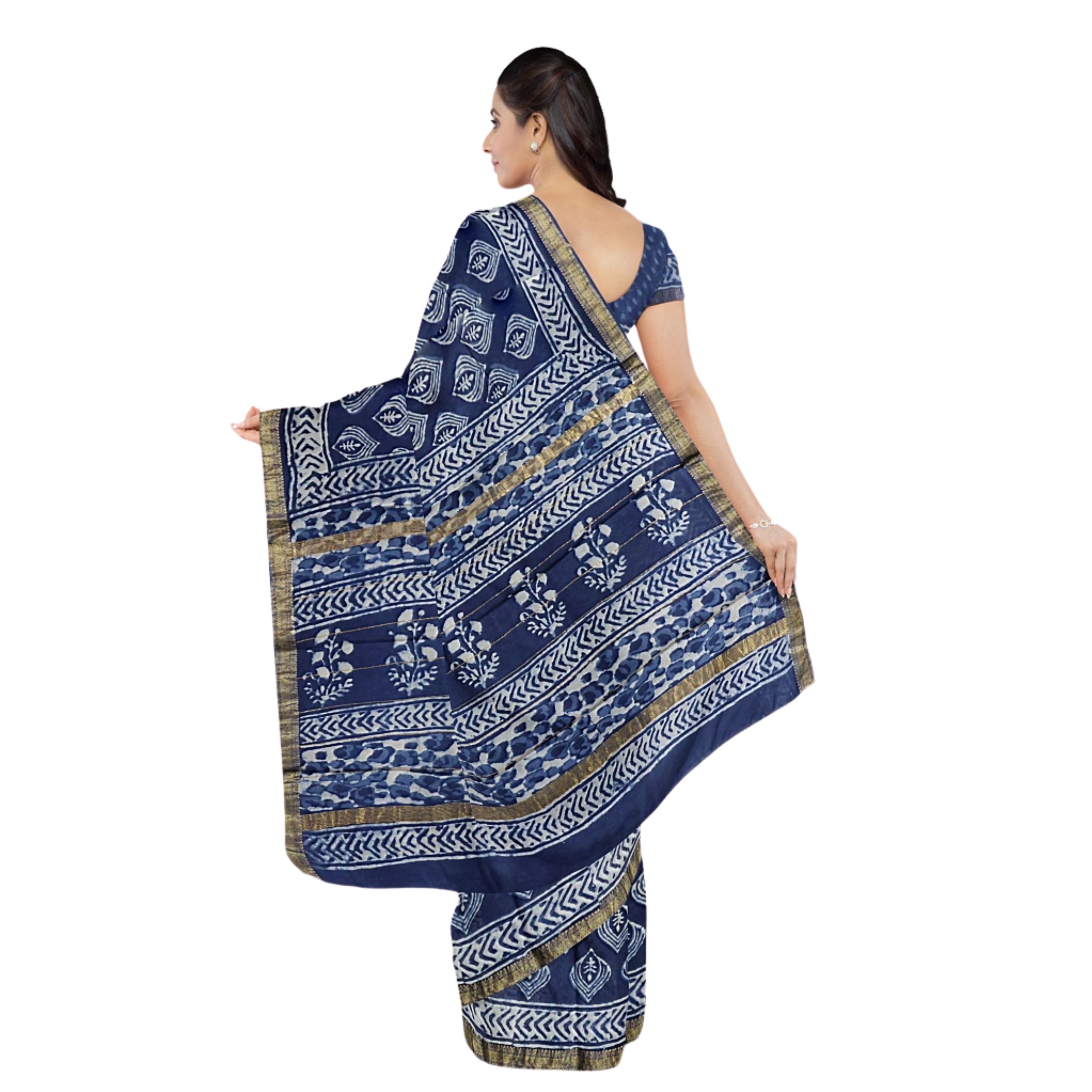 Katan Silk Saree Block Print Blue || Saree 1.10m x 5.5m, Blouse 80cm x 110cm || Saras Aajeevika