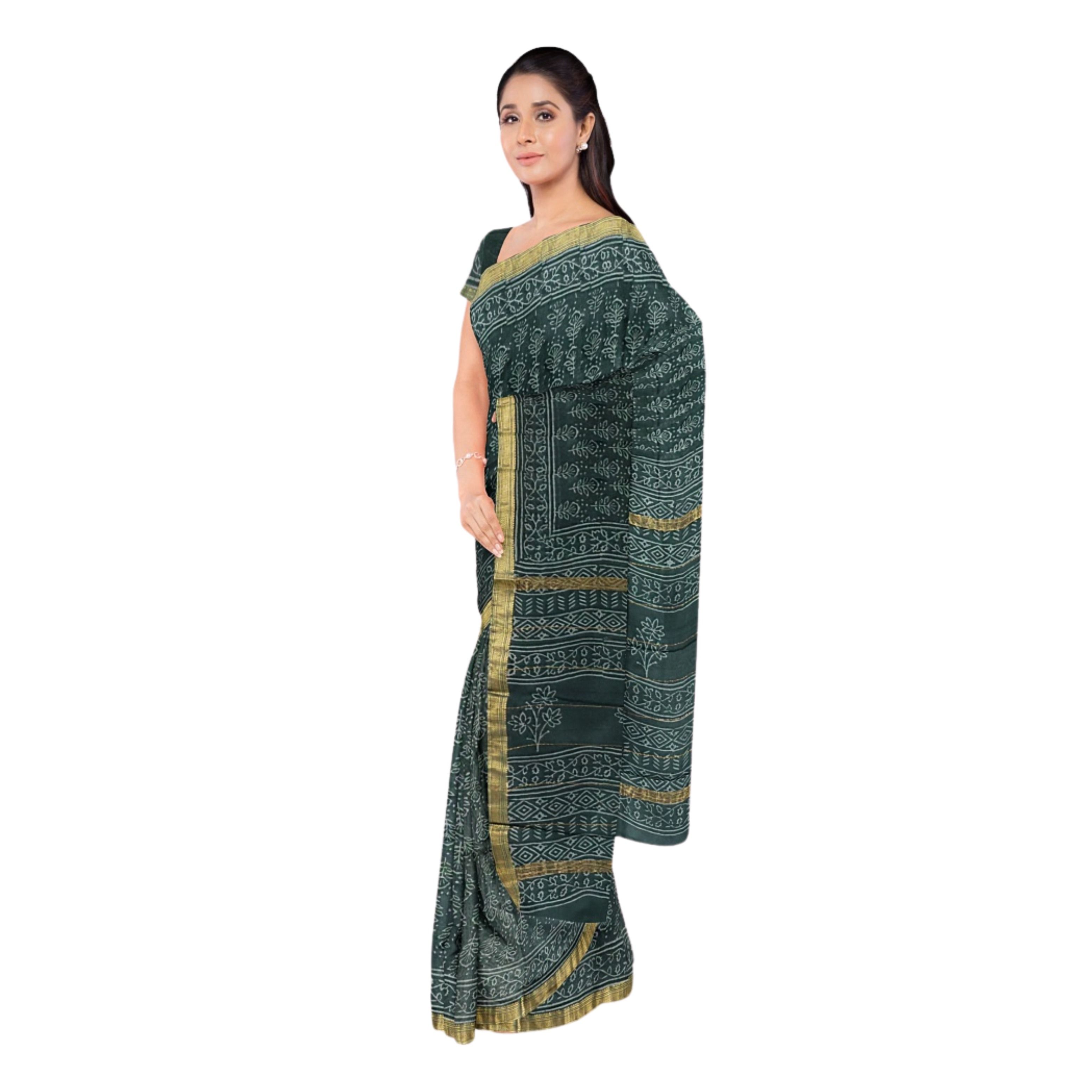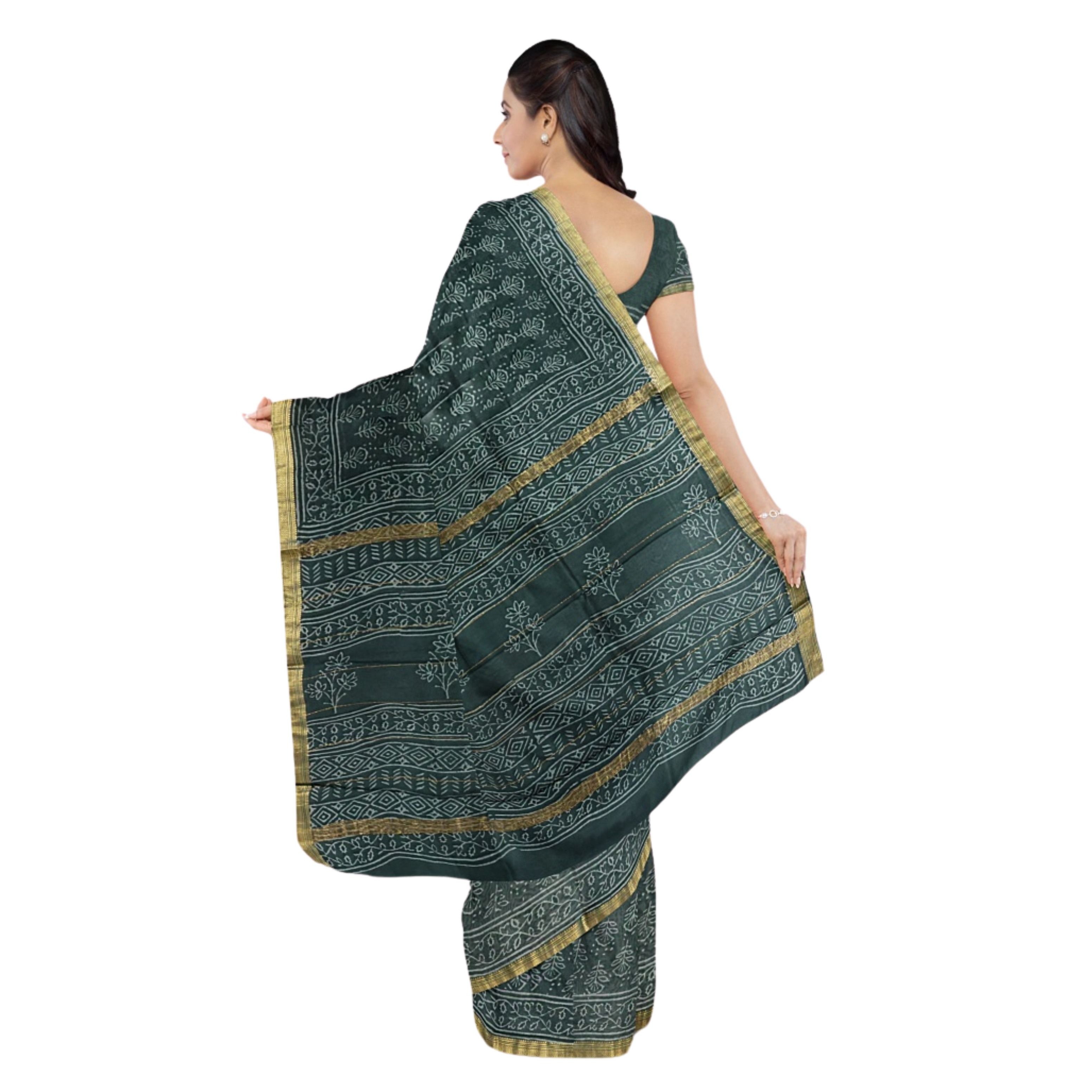 "The Saras Aajeevika presenting Katan Silk Saree with blouse - Hand Block Print Green colour made by Jaishree krishna mahila SHG of Rajasthan.Katan Silk Saree - Hand Block Print Green